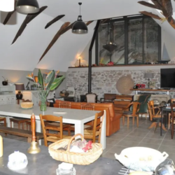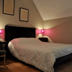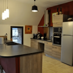 Le rez de chaussée (entrée principale et salle de convivialité pour tout le groupe) comporte 4 chambres (deux avec 2 lits 90×200 jumelables, une avec 1 lit 160×200 + 1 lit 90×200, une avec 1 lit 160×200), 1 salle d’eau + wc accès mobilité réduite, 1 salle de bain, wc indépendant.