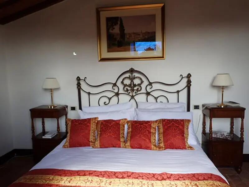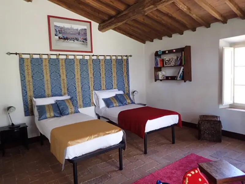 Chambre Firenze au 1er étage avec vu panoramique sur la campagne Siennoise et sur la piscine, équipée d’un lit double, fauteuil, commode et armoire pour cintres.