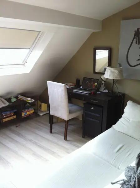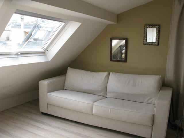 -Un deuxième escalier qui mène à une chambre charmante avec vue imprenable sur les toits de Paris, canapé convertible, bureau. Plein soleil. Une salle de douche+WC+frigo+micro-ondes.