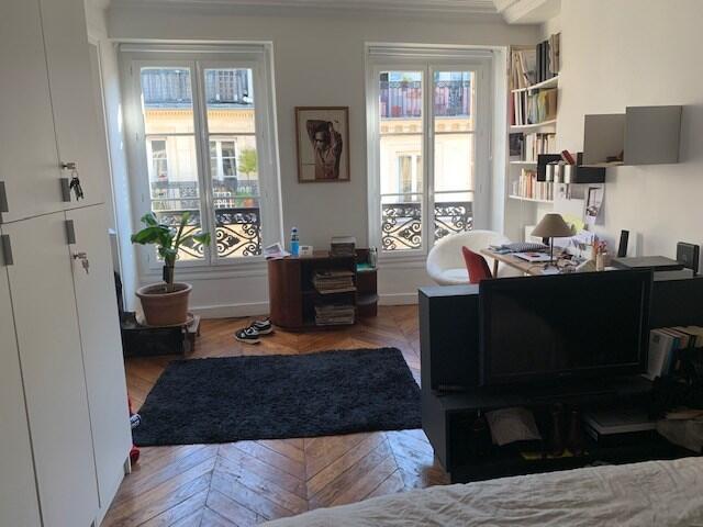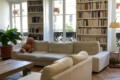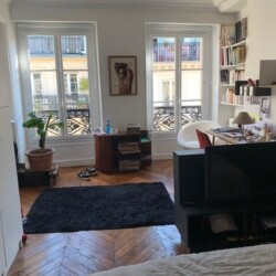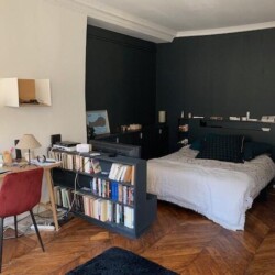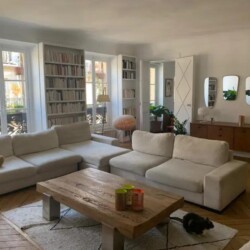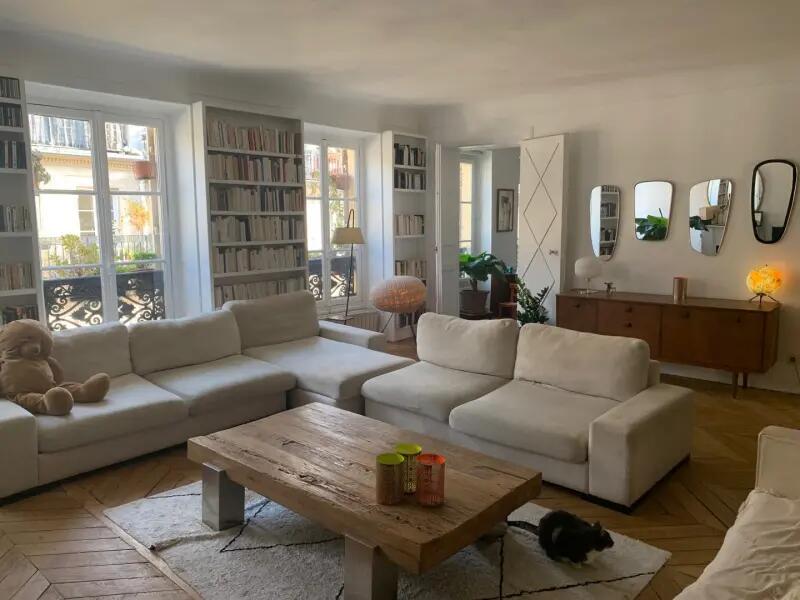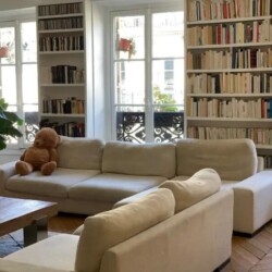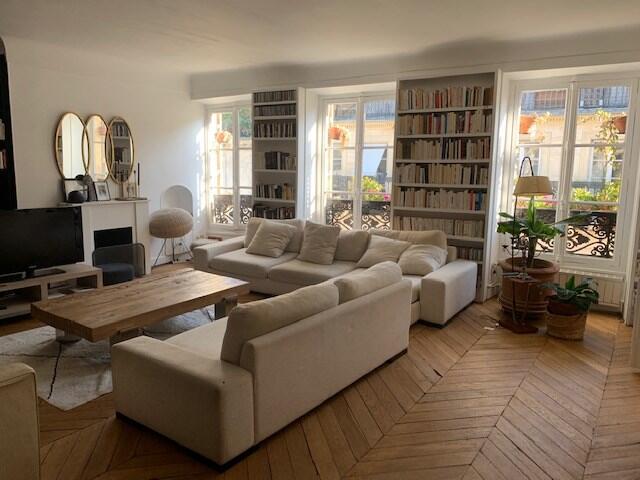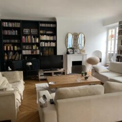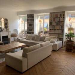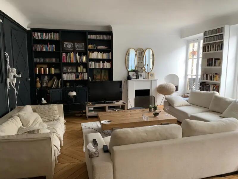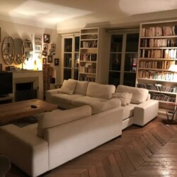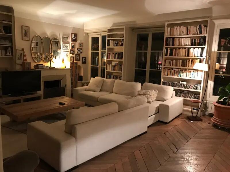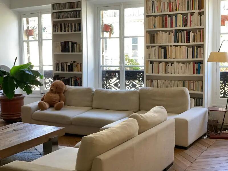 -Un grand salon (40 m2, 3 doubles fenêtres), parquet de Hongrie, grands canapés avec méridienne, grandes bibliothèques (de Rimbaud à Philippe Roth), lumière traversante rue/cour